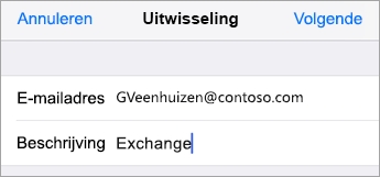Voer uw Microsoft 365, Exchange of Outlook-e-mailadres en een beschrijving van uw account in. Tik op Volgende.