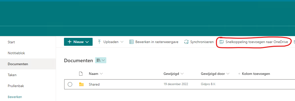 Klik op de "Snelkoppeling toevoegen naar OneDrive" knop.